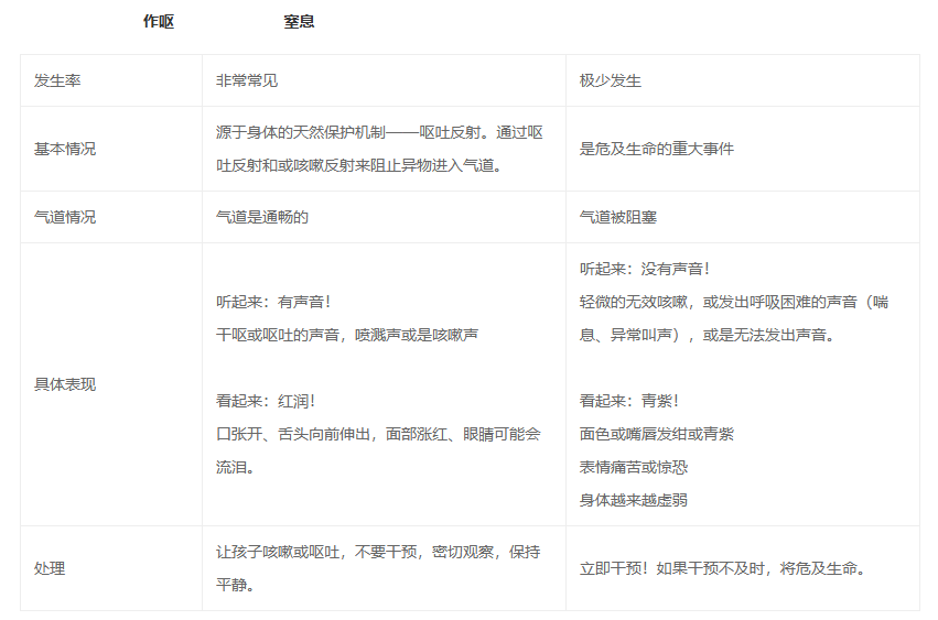 作嘔和窒息的應(yīng)對方式截然不同,如果家長感覺不好分辨,可以記住這句話:"Loud and red, let them go ahead. Silent and blue, they need help from you"——大聲、面色紅,讓孩子自己解決;沉默、青紫,需要立刻給予幫助。