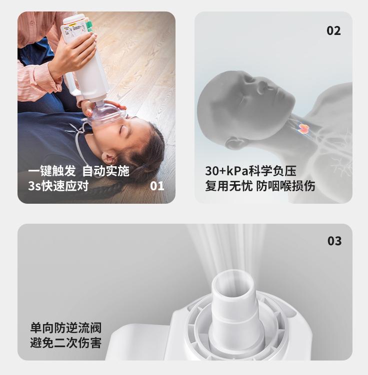 這款防窒息急救器利用負(fù)壓抽吸的原理,在上氣道形成瞬時(shí)負(fù)向氣流,快速將阻塞氣道的異物吸出。使用時(shí),只需一鍵觸發(fā),3秒快速實(shí)施,搭配多款氣囊面罩及壓舌管,適配不同人群,采用單向防逆流閥設(shè)計(jì),只抽氣,不送氣,避免造成二次傷害,30+kpa穩(wěn)定負(fù)壓,防咽喉?yè)p傷,操作簡(jiǎn)單,無(wú)人群使用區(qū)別,無(wú)需專業(yè)訓(xùn)練,輕松實(shí)現(xiàn)自救或他救。
